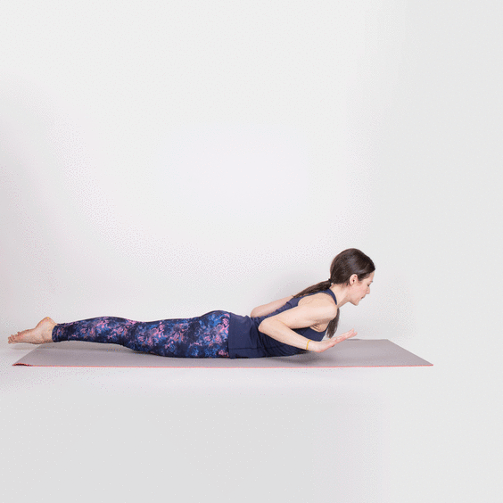 俯卧在垫面上,双手放在胸腔的两侧手肘内夹,呼气,抬起头部打开胸腔,注意脖子延展头在脊柱的延长线上,双手臂向前伸展呼气,屈手肘,双手臂呈“W”型手臂向脊柱的中线夹吸气,双手臂向前伸展重复练习10-20次动作3:加强中下背部