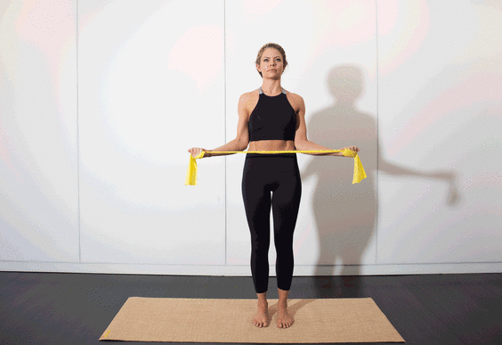 站立,双脚分开与髋同宽双手手臂夹住胸腔,双手握弹力带屈手肘,掌心朝上呼气,保持双手臂夹住胸腔双手向两侧拉开弹力带大臂做外旋,吸气,还原重复练习10-20次动作2:加强上背部