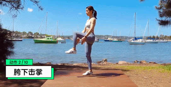 动作五:站姿两侧提膝击掌(10-15次,重复2组)
