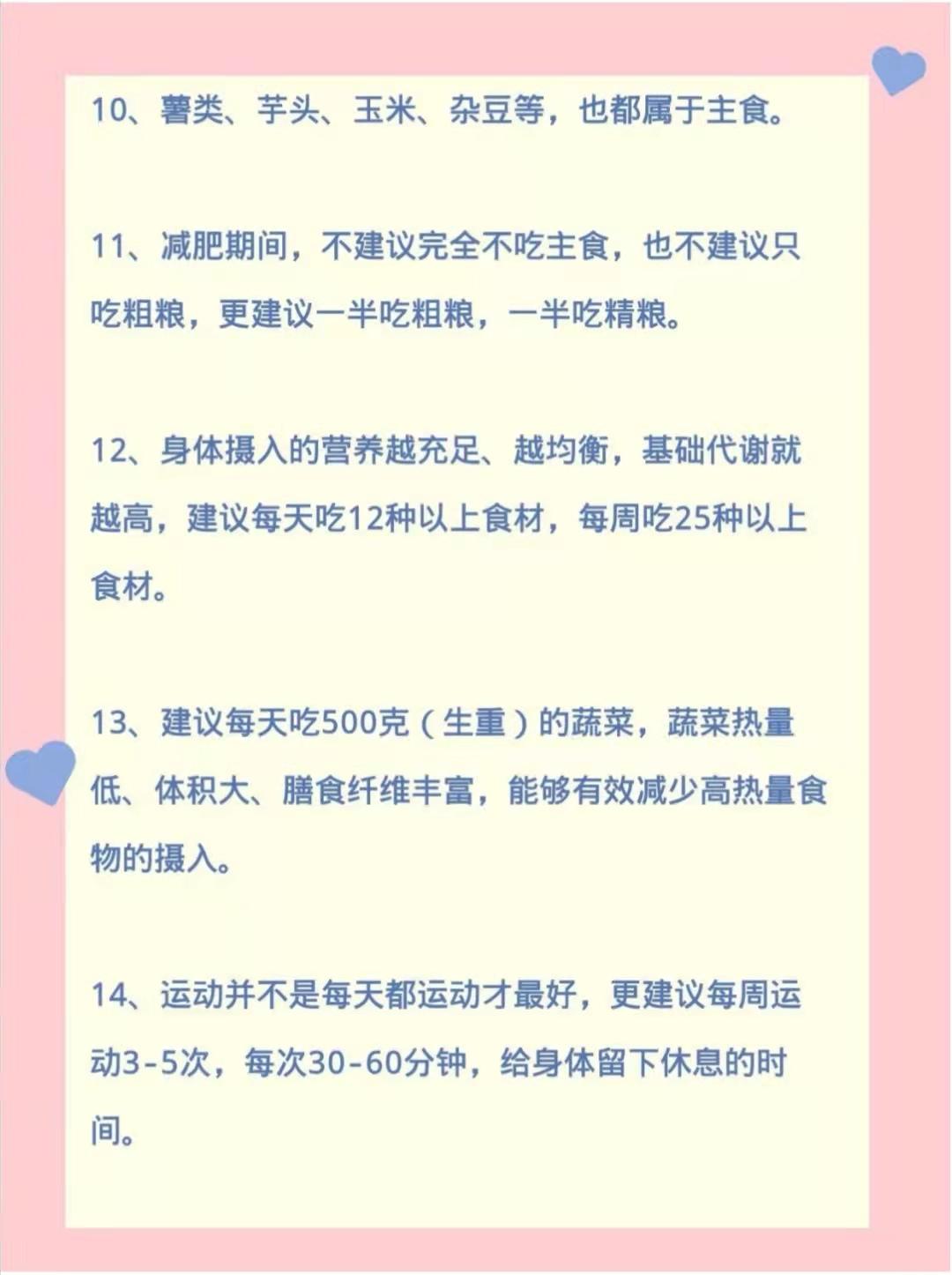 12、身体摄入的营养越充足、越均衡,基础代谢就越高,建议每天吃12种以上的食材,每周吃25种以上食材。