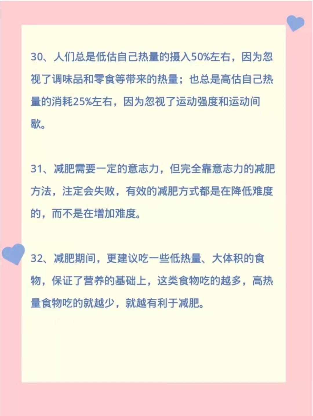 30、人们总是低估自己热量的摄入50%左右,因为忽视了调味品和零食等带来的热量;也总是高估自己热量的消耗25%左右,因为忽视了运动强度和运动间歇。
