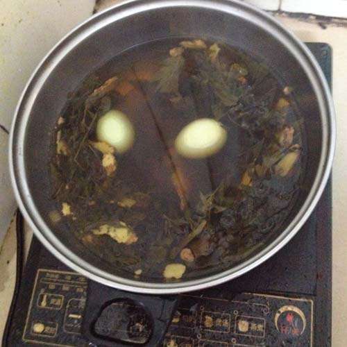 方法:先把鸡蛋煮熟,剥掉蛋壳(因为怕蛋壳上有脏东西,所以一开始不要把艾叶和生姜放进去),然后把材料都放进水中煮沸转小火煨片刻。然后就可以吃鸡蛋,汤也是可以喝的。