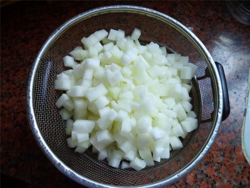 1、备好所有的食材,将冬瓜去瓤、去皮之后用刀切成小块备用,冬瓜块要切的小一些,冬瓜皮不要扔掉哦,后面煮汤时还要用。许多人吃冬瓜时都习惯去掉冬瓜皮,建议大家还是要保留冬瓜皮,冬瓜皮的营养价值也高。