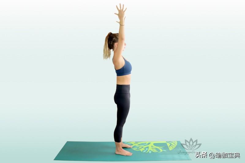 2、向上敬礼姿势-Urdhva Hastasana吸气并将手臂举过头顶。