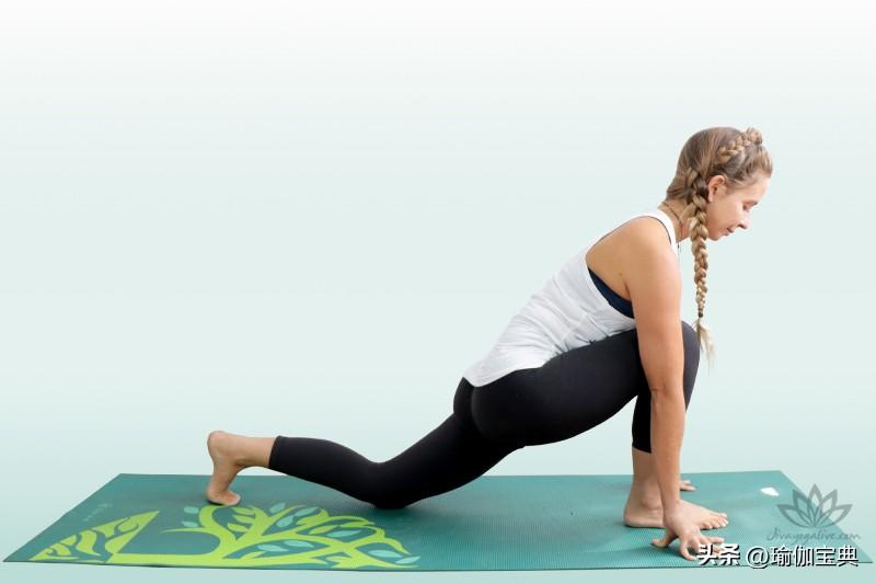 4、低弓箭步-Anjaneyasana练习时脊柱是直的,头和脖子在一条线上。