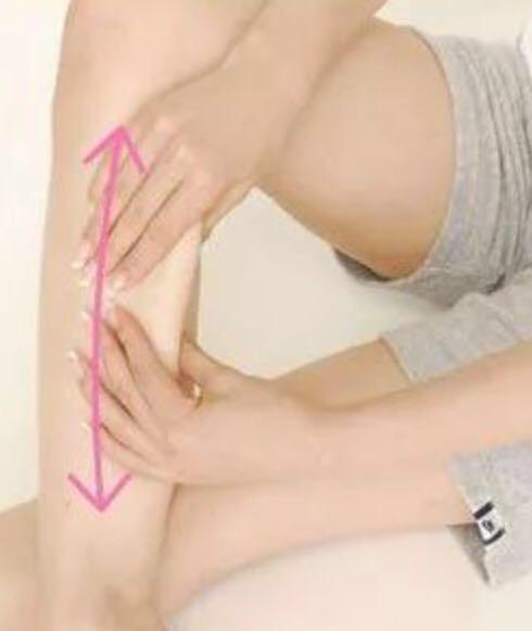 利用虎口以及手掌由下向上按摩小腿前侧。