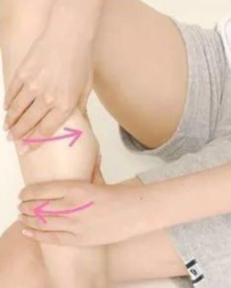 把拇指放在膝盖上面,两手握住大腿的肌肉边按压边按摩,重复5次。