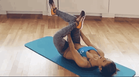 仰卧,右腿膝盖弯曲,左腿腕压在右腿膝盖上方,双手抱住右侧大腿向身体方向缓缓靠拢。