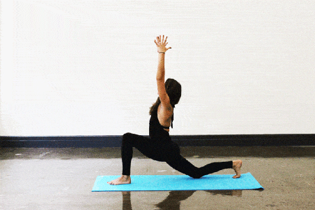 具体做法:跪姿开始 ,首先吸气,将左腿迈出一大步并弯曲左膝,但不能超过左腿前侧,左脚脚掌要紧踩地面;右腿伸直,保持脚尖点地,向前推送髋部。双手撑地,上半身向前弯曲,并保持腹部与左大腿紧贴 ,背部要保持平直 。身体尽量向前延伸,呼气 。吸气 ,上半身向上伸展,并将两手放置于髋部,伸直右腿向前靠。保持此动作2~3个呼吸。吸气双臂用力带动身体向上,举过头顶 ,同时右膝膝盖着地。再次吸气 ,双臂用力带动身体向后仰 ,感受后侧脊椎的挤压感。维持5~8个呼吸 ,上身慢慢恢复 ,换腿继续进行练习 。