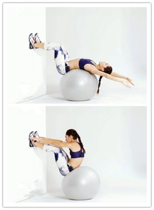 ⑤ 背对着墙,躺在瑜伽球上,双脚抵住墙壁做支撑,双臂伸展向前。利用腰腹的力量,抬起躯干离开瑜伽球,双臂伸展举过头顶,直至身体呈一条直线,然后落下回到瑜伽球上。这样为一次,15次为一组,做3组。