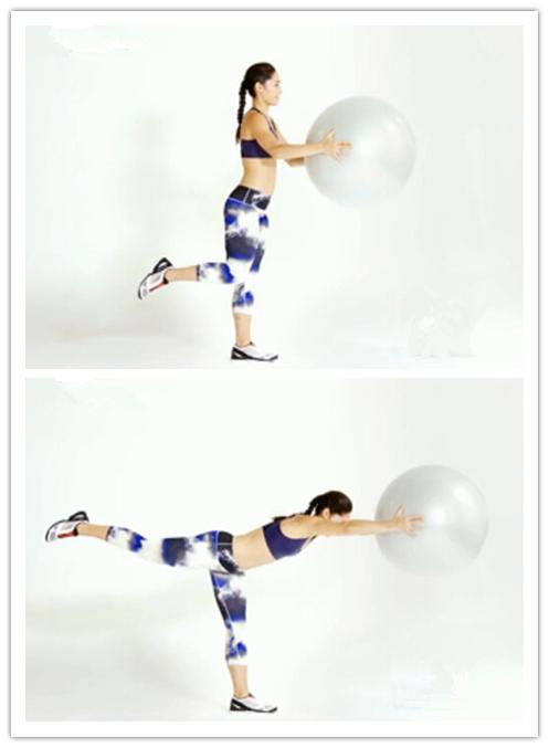 ④ 站立,右脚在身后弯曲90度,双手抱住瑜伽球置于胸前。以臀部为核心,身体弯曲向前,双臂举球向前伸展,右腿向后伸直,直至身体与地面平行。然后,回到刚才的动作。这样做20次,换另一侧重复,视为一组。做3组。