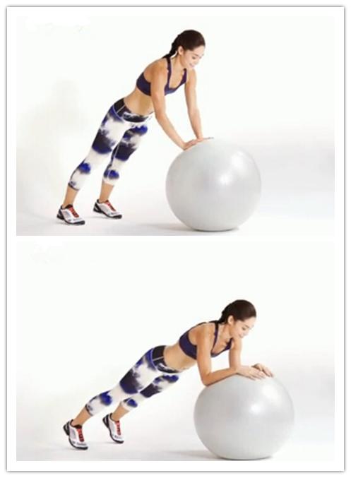 ③ 从完全平板支撑开始,双手放在球的中心,双脚分开稍稍大于肩宽。将球往前推,使肘部弯曲呈90度,做肘部平板撑,将球往回拉,回到完全平板支撑。这样来回为一次,15次为一组,做3组。
