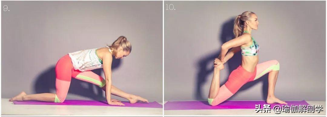 山式站立,将左脚向后一大步小腿脚背贴地,右小腿垂直垫面双手扶髋,左脚前脚掌推地吸气向上立直脊柱,呼气慢慢的沉髋保持20-30秒动作9-10: