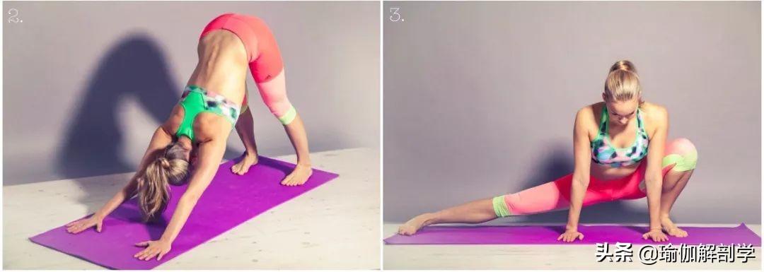 俯卧在垫面上,双手放在胸腔的两侧双脚分开与髋同宽吸气延展脊柱,呼气脚尖回勾坐骨向上,伸直双腿进入下犬式,保持20-30秒山式站立,双脚打开约一腿长的距离吸气延展脊柱,呼气屈膝身体靠近左腿双手放在身体的前侧保持20-30秒,换另一侧动作4-5: