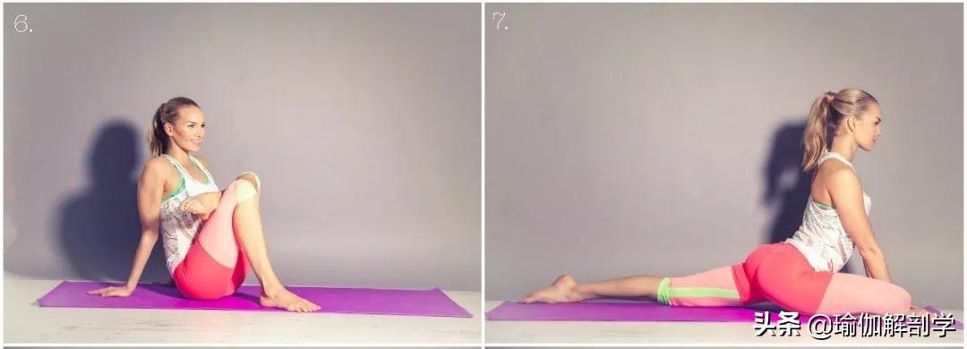 坐立在垫面上,屈双膝身体向后倾斜,双手支撑在垫面上将左脚放在右大腿上左腿向下找地面保持20-30秒,换另一侧山式站立,将左脚向后一大步小腿脚背贴地,右小腿垂直垫面双手放在身体的前侧屈右膝向外打开,右小腿放在身体的前侧右腿贴实垫面,吸气延展脊柱呼气慢慢的俯卧向下,保持20-30秒动作8: