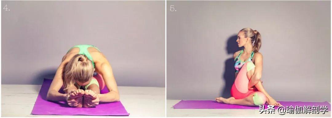 坐立在垫面上,双腿伸直并拢吸气延展脊柱,呼气俯卧向下双手可以抓住前脚掌初学者可以借用伸展带坐立在垫面上,双腿并拢伸直将右脚放在左大腿的外侧左脚从右腿的下方穿过放在右侧臀部的外侧吸气延展脊柱,呼气向右扭转右手放在身体的后侧如果可以的话,将左手从右腿前侧下方穿过双手交握,保持20-30秒,换另一侧动作6-7: