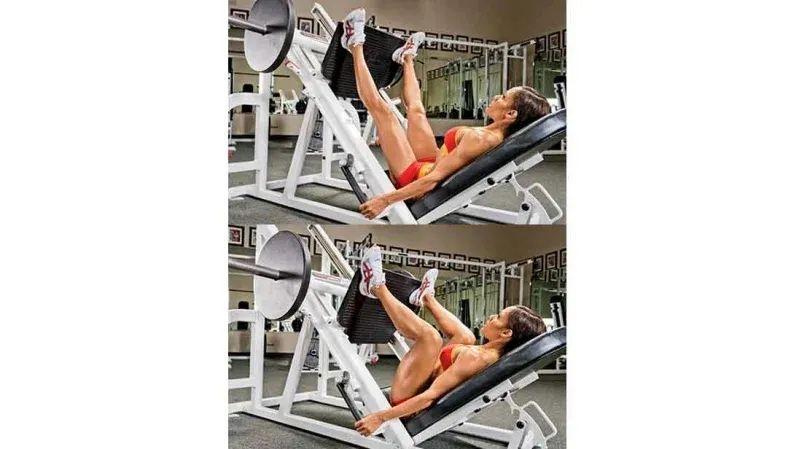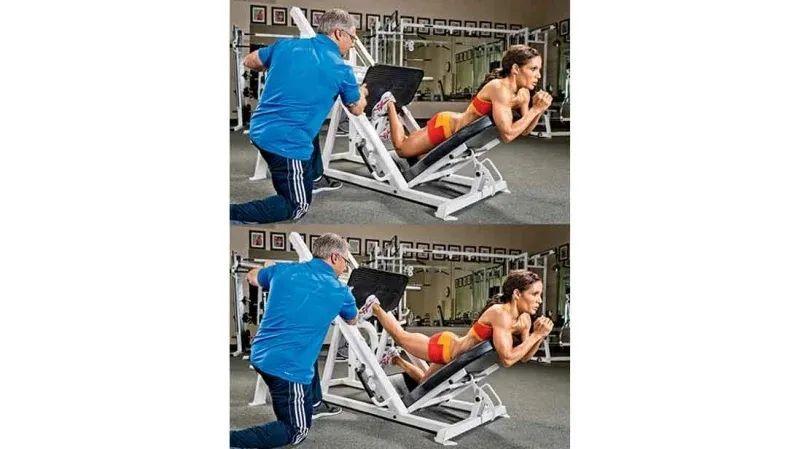准备好:仰卧在 45° 腿部推举机上,将双脚高高放在平台上,这样只有脚跟在顶部外角处搁在平台上,脚趾指向 45° 角。