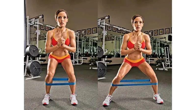 准备:在膝盖下方系一条阻力带,然后下降到四分之一蹲的位置,双脚分开略大于肩同宽,以在阻力带上施加张力。