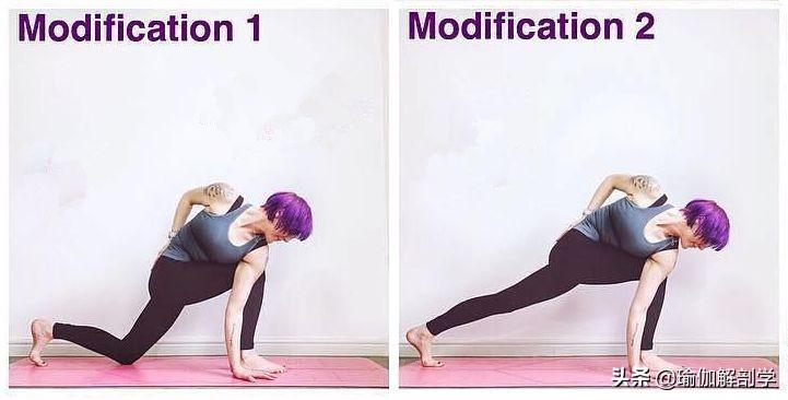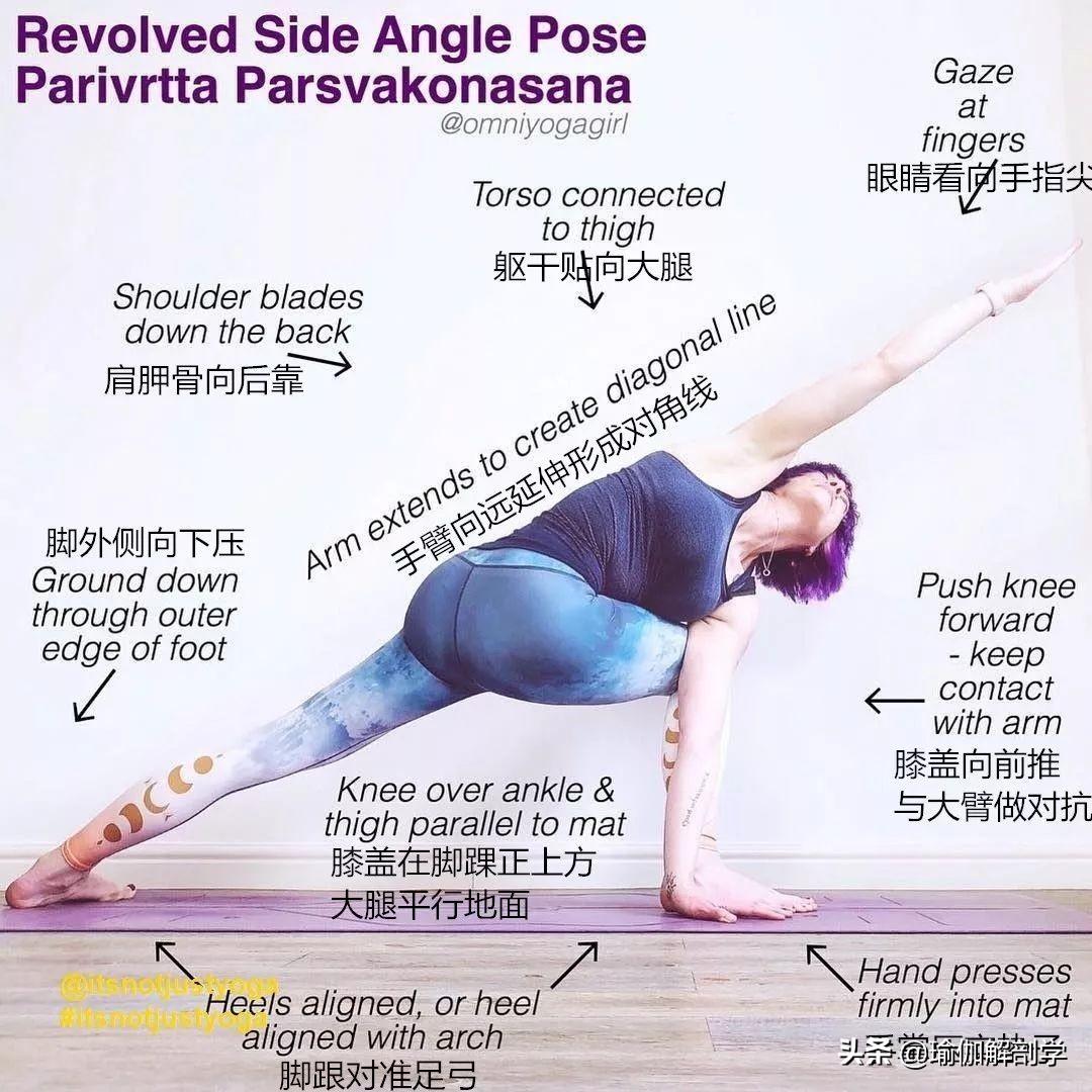 双脚分开大于一腿长,脚跟对足弓后方腿伸直,大腿收紧向上提前方大小腿垂直,膝盖向外展开右髋向后,左髋向前,髋部中正肩胛骨内收,脊柱充分扭转下方手与膝盖做对抗,加深扭转上方手臂延展,指尖指向斜上方脖子在脊柱延长线,眼睛看手指尖扭转侧角式正误对比图