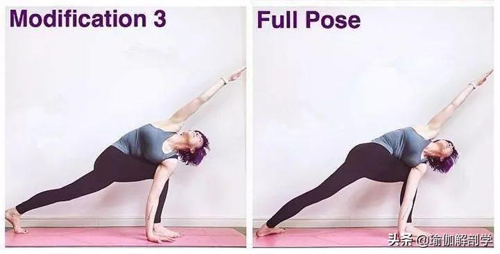 解开右手,手臂上举,大臂贴耳转头看手指尖,双肩放松也可双手胸前合十,脚跟向下踩地扭转侧角式的细节