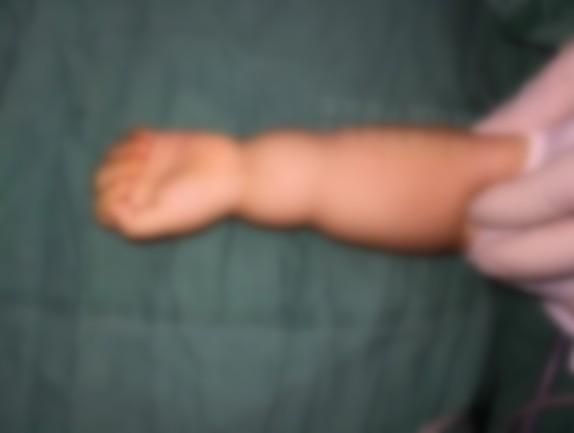 出生时可见完全性或不完全性环绕肢体软组织的凹陷,多发于小腿,足趾、前臂、手指,偶尔在躯干也有发现,可能造成肢体畸形。