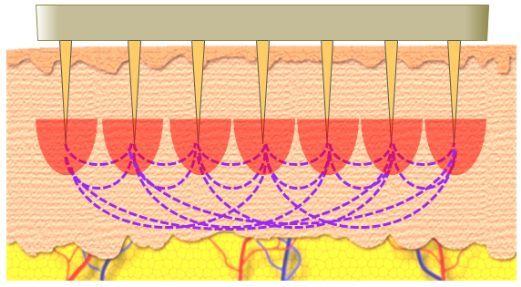 微针刺透表皮,将射频能量以点阵模式倒入深层组织,刺激胶原收缩,促进重建。