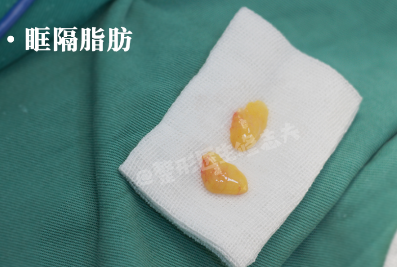 因为脂肪垫/团比较完整独立,我们可以通过手术切除部分,所以肿泡眼矫正、祛眼袋手术时,你可以看到切除下来的整块脂肪团: