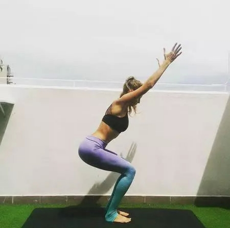做法:半蹲,背向前弯45度,收腹,双手笔直抬高,坚持1分钟,可以拉伸我们的臀部、胸部、脊柱和膝盖,降低身上多余的脂肪堆积,也能增强腰背部的力量。