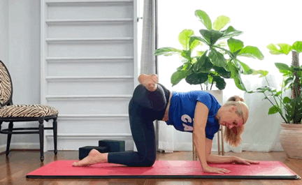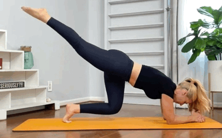 四足跪进入,双手肘落地双膝向上抬高,小腿平行地面吸气,右腿向后伸直抬高呼气,收紧核心,右腿屈膝向前吸气,还原,重复10-15次换边08