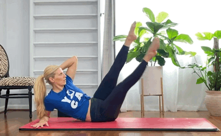 保持上一动作的基础,左手抱头双腿伸直抬高,与地面垂直呼气,收紧核心,右腿向下落地保持绷脚背,重复15-20次换边03