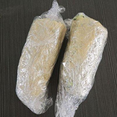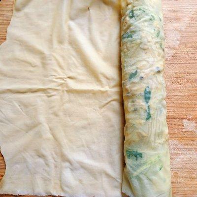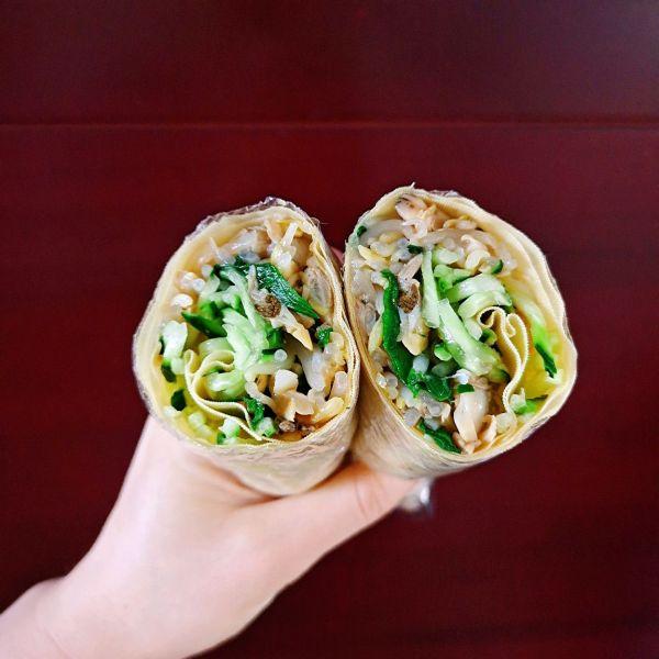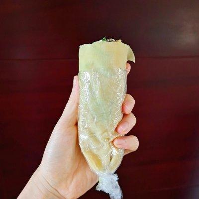 10、吃的时候保鲜膜下拉即可 (不同于面饼,保鲜膜不会和饼皮黏连,所以很好下拉) 下面锁住,还避免了菜里汁水的流出