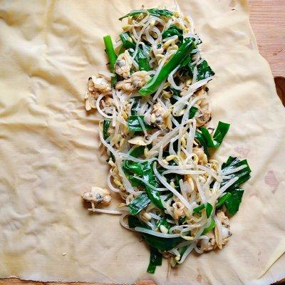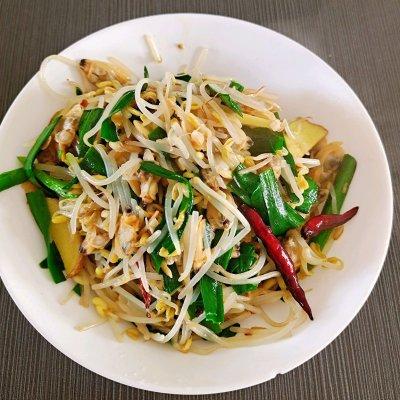 用料绿豆芽 300克花甲肉 150克韭菜 十来颗干辣椒 5个姜片 3片盐 适量料酒 1勺鸡精 适量黄瓜丝 适量食用油 1勺做法步骤