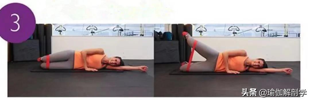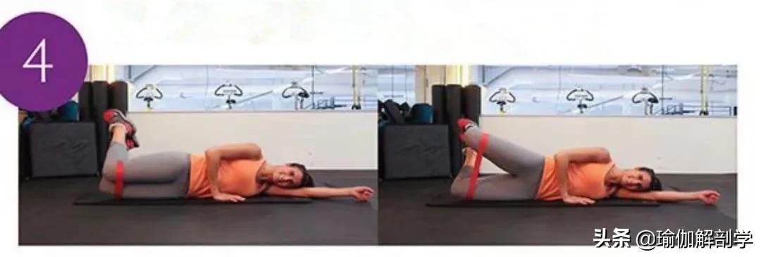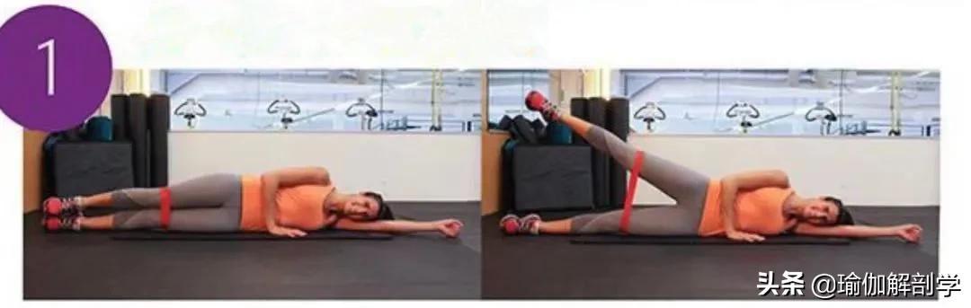 左侧卧,右手放身体前侧辅助稳定大腿前侧套上弹力带右臀发力带动右腿上抬Hold住5秒为一次练习8-10次后换另一侧动作02、