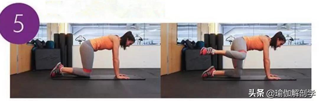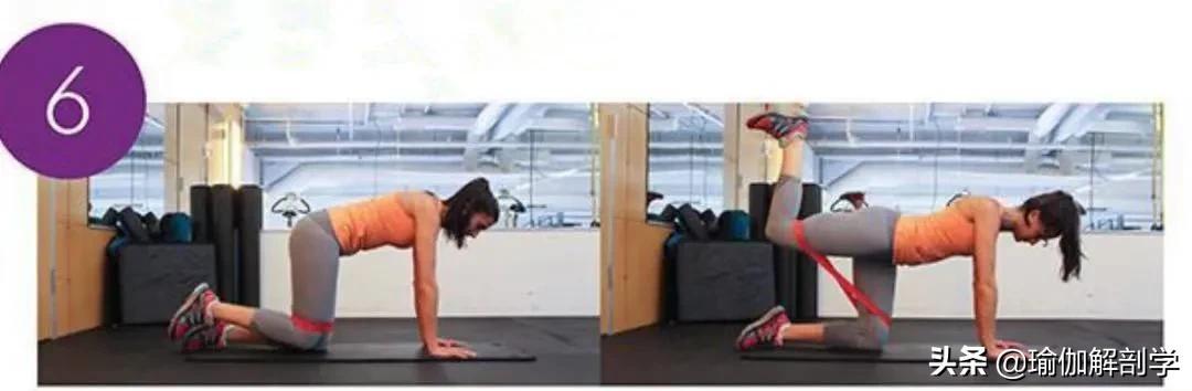 四足支撑式准备大腿前端套上弹力带呼气,收紧核心,骨盆保持稳定右髋外展,右腿向右侧抬高动态练习8-10次,换另一侧动作06、