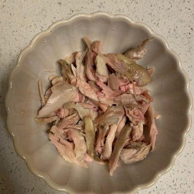 2、把鸡肉撕成条,减肥的亲可以把鸡皮剥掉不要。