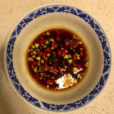 3、小米辣 蒜都切碎,倒入生抽两勺 陈醋一点点 白糖一点点 盐 鸡精 胡椒粉 香油调味。喜欢吃花椒味的还可以加一点花椒粉或者藤椒油。