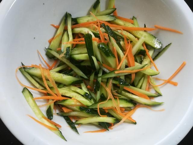 6、 将胡萝卜丝和黄瓜丝放入碗中加入少量的盐,腌制五分钟,倒出多余的水分。