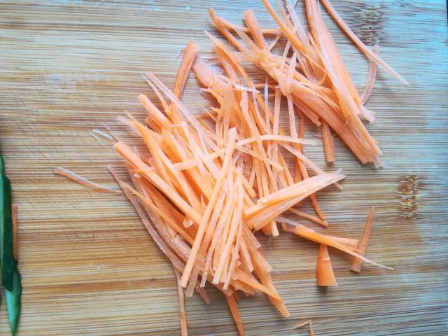 4、 胡萝卜要切成丝细,放入碗中加入一小勺的盐,腌制大概5分钟,过滤掉多余的水分。