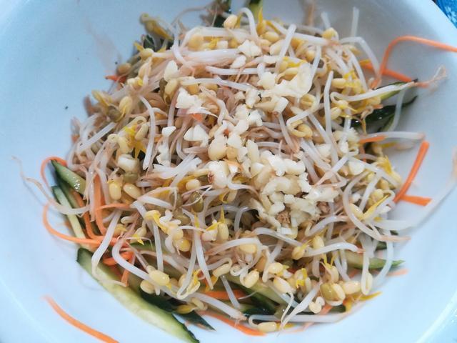 【配料】:绿豆芽200g,黄瓜1根,葫芦卜半根,盐两勺,糖15g,生抽1勺,大蒜3颗