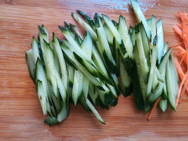 3、 将黄瓜切成丝,不用切的太细可以适当粗一点,吃起来口感更佳。