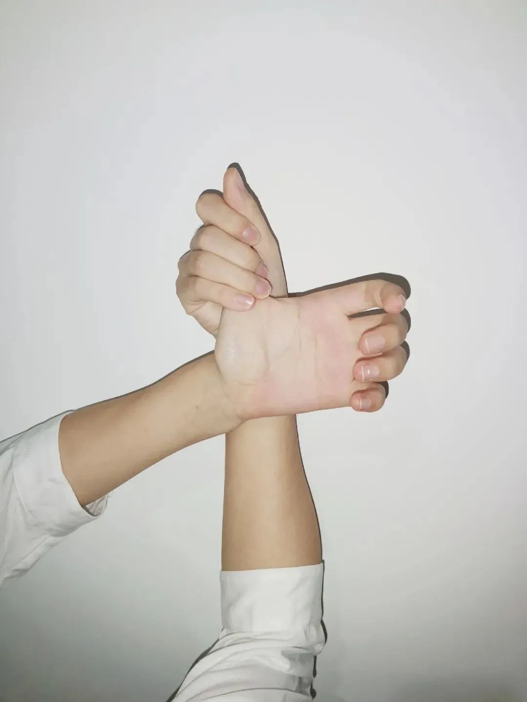 法二:坐位或站立位。患者患侧手肘伸直,健手以“7”字形分别固定患手拇指和四指,同时进行手指和腕部、肘部肌群的牵伸。(8-15s)