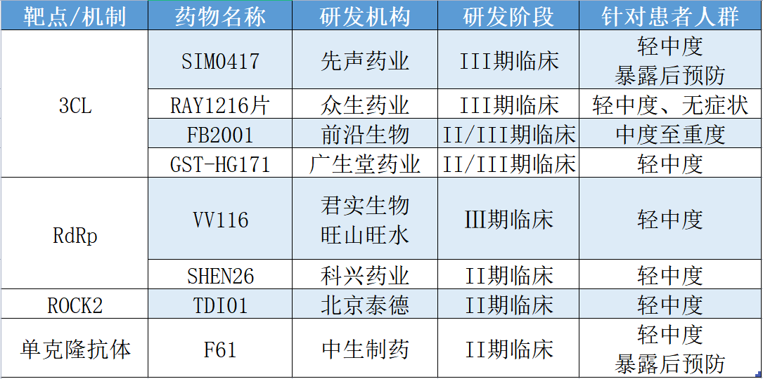 针对这一靶点,目前国内在研的新冠抗病毒药物主要有君实生物(688180.SH,01877.HK)和苏州旺山旺水生物医药有限公司共同研发的VV116,以及科兴制药(688136.SH)的SHEN26等。