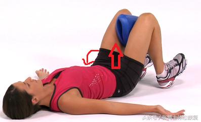 如上图所示,臀桥姿势开始,两腿之间夹紧一个垫子,脚尖抬起来,收缩臀肌和盆底肌将骨盆向上抬起至大腿跟身体呈一直线,这是注意收缩腹部(收紧腹横肌)避免骨盆前倾,保持5秒,然后慢慢还原,每组重复10次,做3-4组。