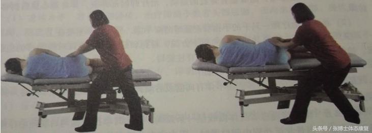 前缩模式:患者取侧卧位,屈膝、屈髋,调节师一只手放在髂骨上,手指位于髂肌前,阻力方向向后向下,患者对抗阻力进行向前向上的骨盆运动。