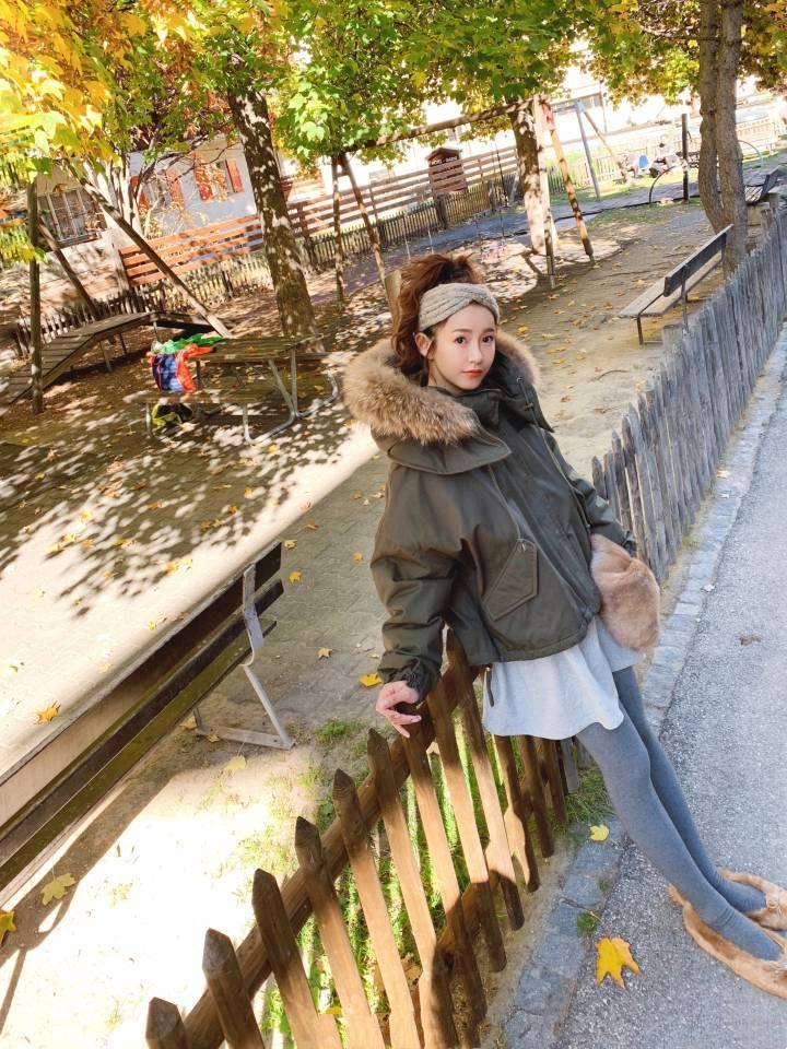 灰色打底裤搭配毛毛鞋,上衣是a字形的短裙外搭军绿色休闲短棉衣,时髦的像18岁。而发型选择比较俏皮可爱的马尾辫,搭配针织发带,时髦又减龄。