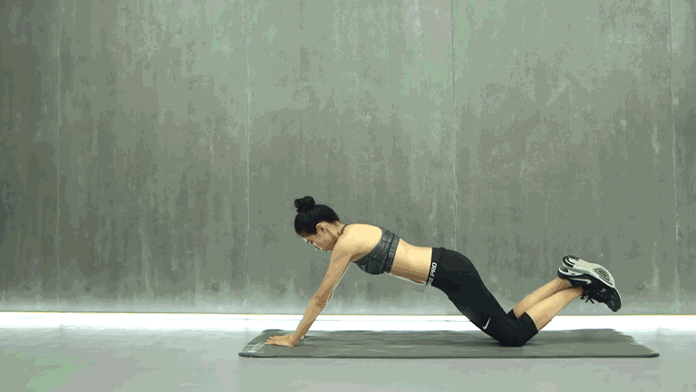 4.额前俯卧撑:双手交叉置于额前;肩胛骨加紧,肩膀下沉,臀部夹紧;吸气时下降,主动降低身体,小臂不动,肘关节向外伸出;呼气时,肱三头肌发力向上推起身体。