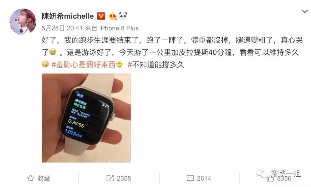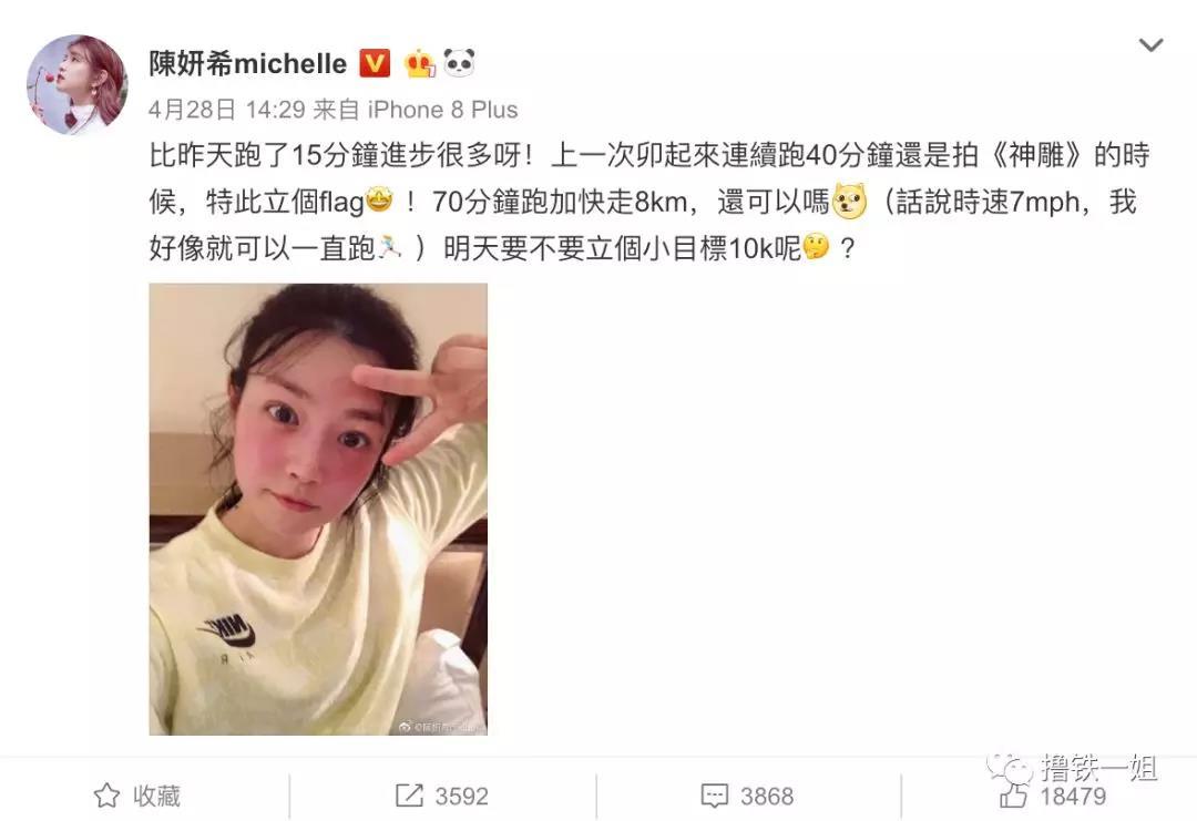 她上次跑步相关的微博是4月底的时候,跑了40分钟面红耳赤,并且立下flag下次要跑70分钟8km的量。一个月时间,跑了几次咱们也不敢问,反正是放弃了。