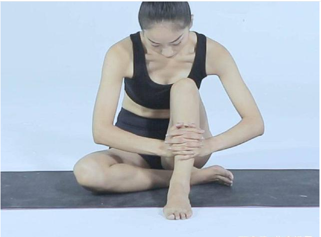 准备姿势:坐位,左腿屈膝,右腿自然弯曲放置,双掌放于左小腿中部两侧,掌心相对过程:双手抱小腿,虎口向上,双掌向内发力挤压小腿,每一次挤压持续1~2秒,再向下,直到小腿足跟,挤压时掌心力线相对