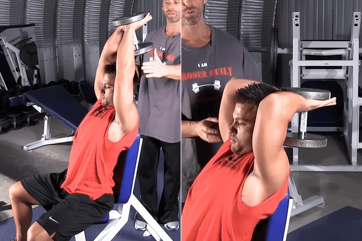 1.哑铃颈后臂屈伸:这个动作是练习肱三头肌的重要动作之一,比杠铃更能深程度的刺激三头肌内侧,而且哑铃更加灵活。一般我们采用坐姿来练习这个动作。