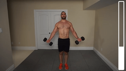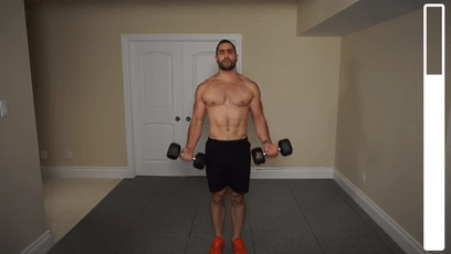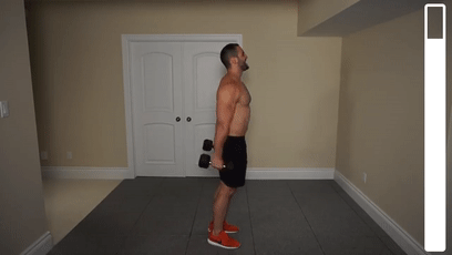 站立,上身挺直,双手反握哑铃置于身体两侧略向外张开胸部发力向上抬起哑铃至胸部正前方,顶点稍停挤压胸部缓慢下放还原,不要让手臂自由落体